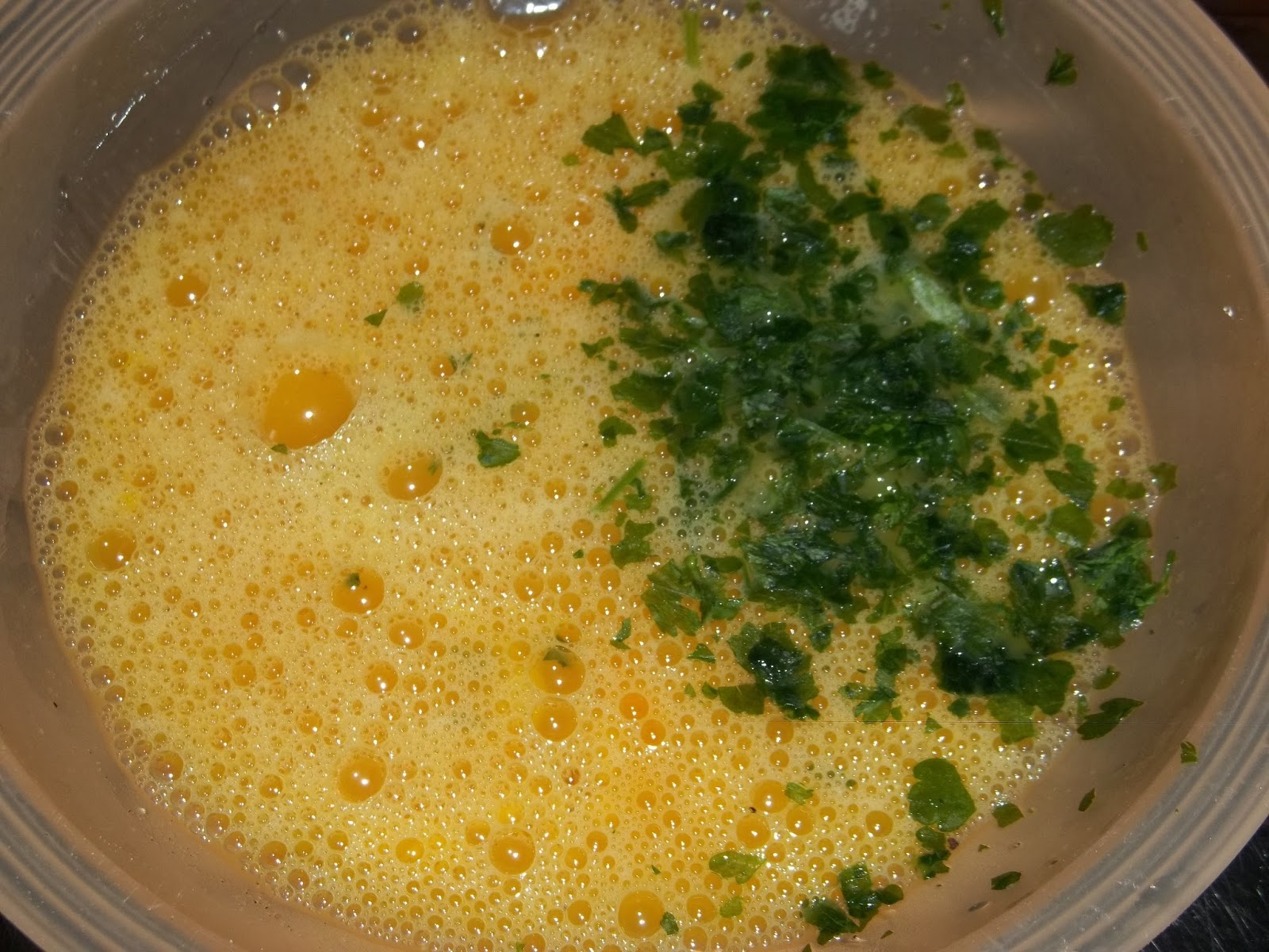 in una ciotola rompere le uova , a parte tritare il prezzemolo con lo spicchio d’aglio finemente e uniamolo alle uova leggermente sbattute , aggiustiamo di sale e pepe e sbattere per bene lasciare riposare per 10 minuti..