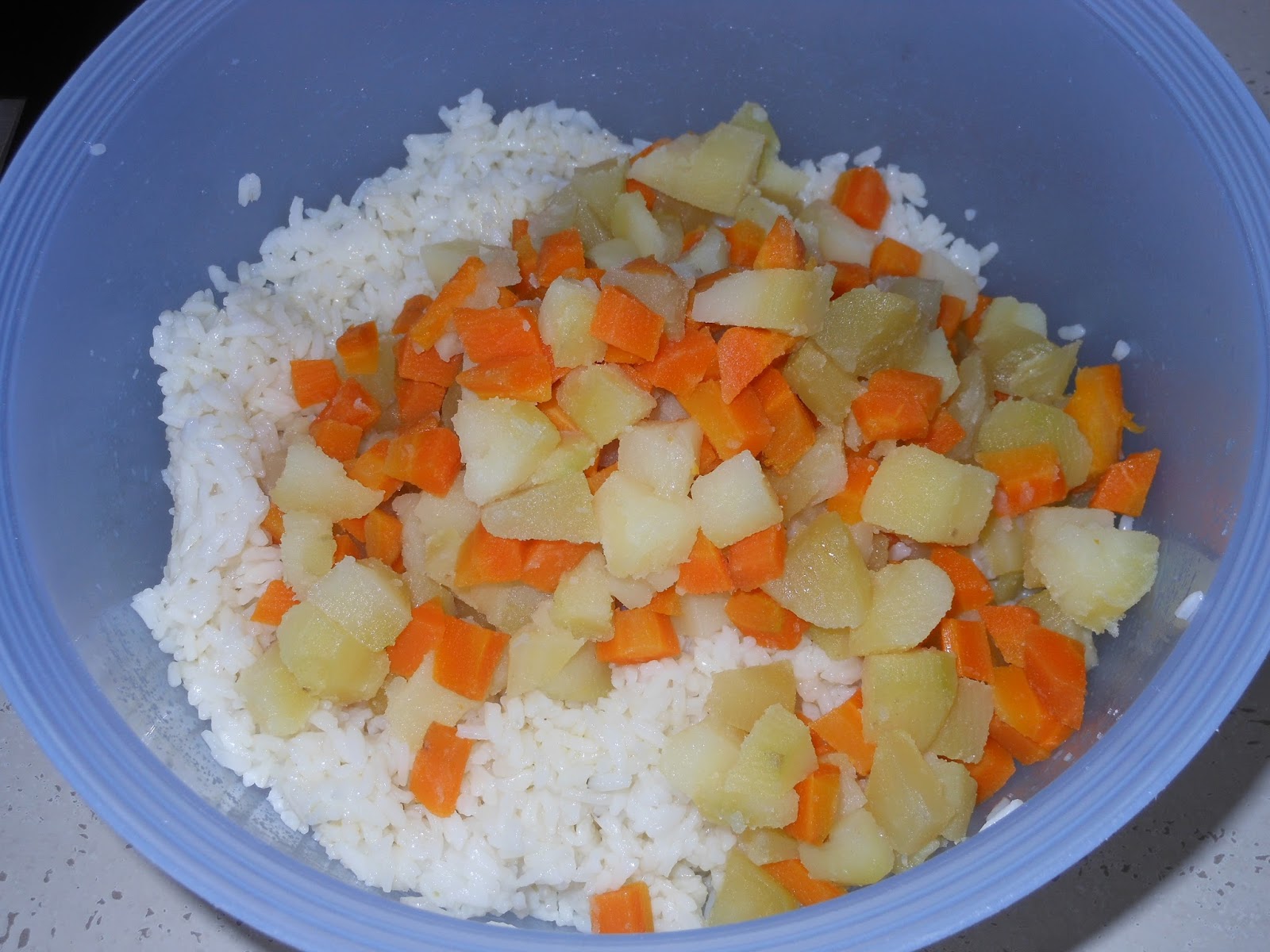 tagliate le carote e le patate a cubetti e unitele al riso , mescolate con un cucchiaio ..