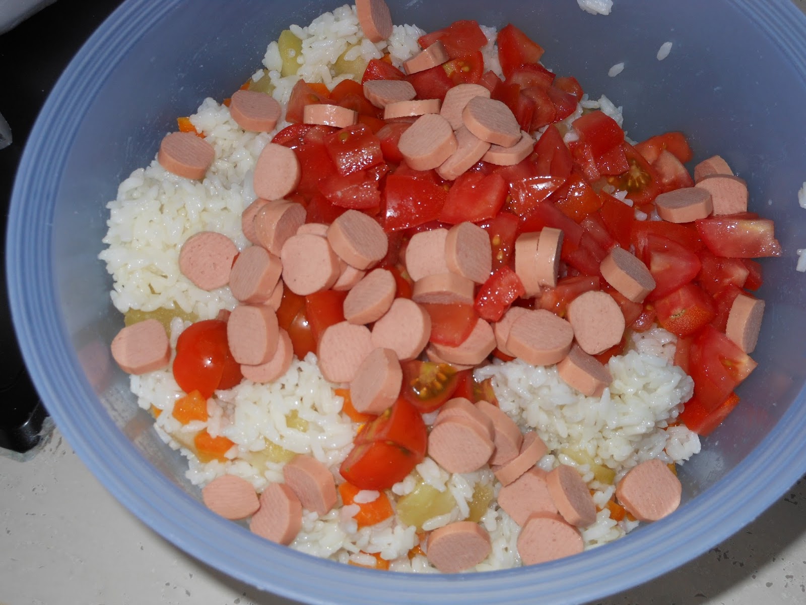 tagliate a rondelle i wurstel , lavate e asciugate i pomodorini e divideteli in 4 parti aggiustate con un pizzico di sale , e uniteli al riso , mescolate per far insaporire..