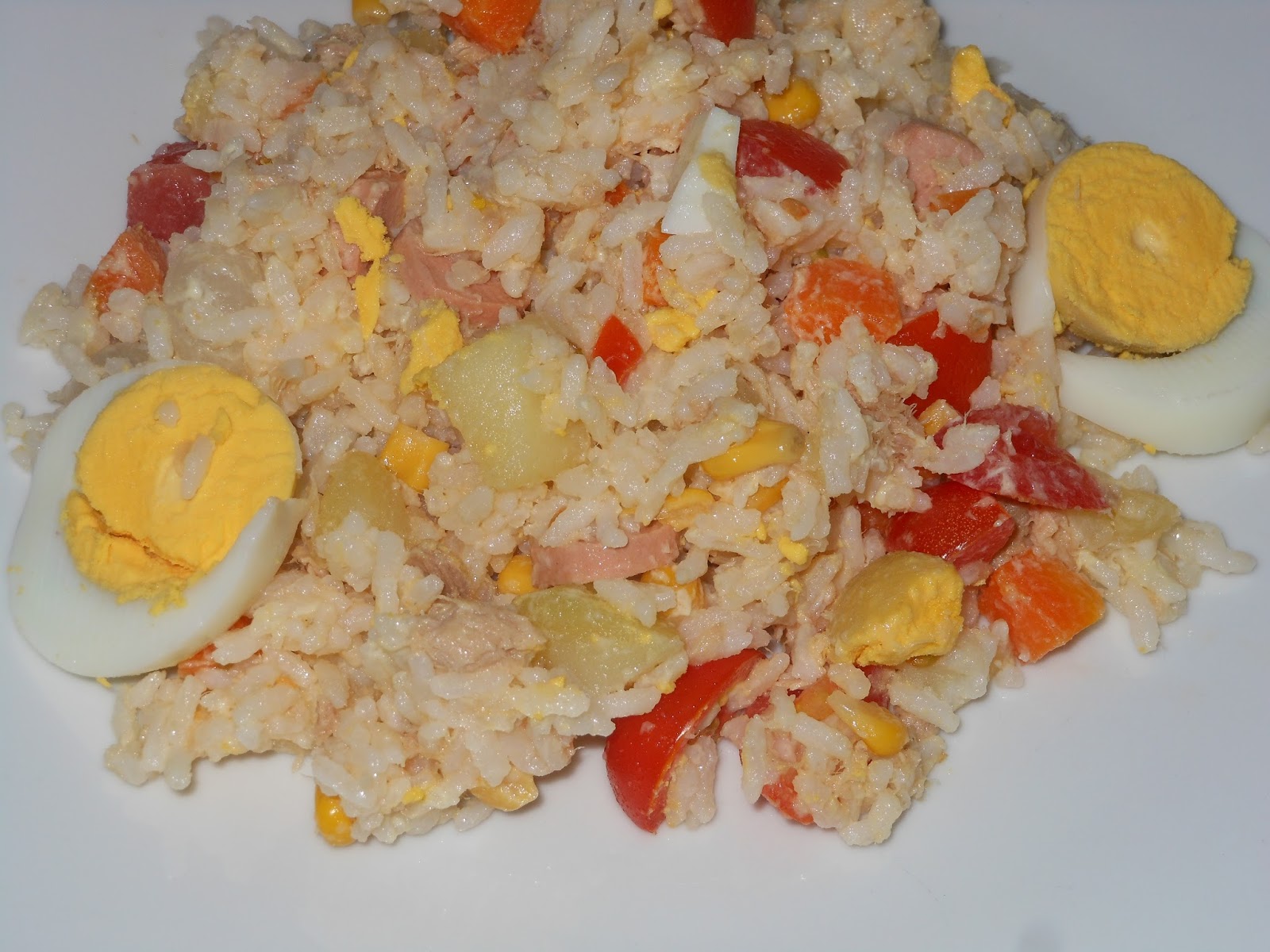 unire del mais in scatola , sbriciolare il tonno e unire al riso mescolare bene , aggiungere la maionese e mescolare il tutto per insaporire , prendere le uova lesse sbucciate e tagliare a pezzi unire al riso aggiustare il riso di sale se serve , mescolare bene il tutto e mettere in frigo fino al momento di portare in tavola o al mare …