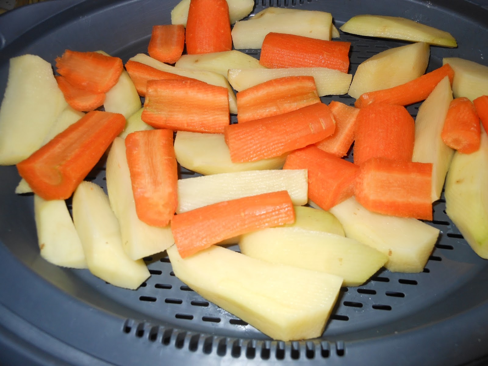 pelare le carote e patate , dividerle e tagliarle a tocchetti appoggiarle nel varoma e nel vassoio ..